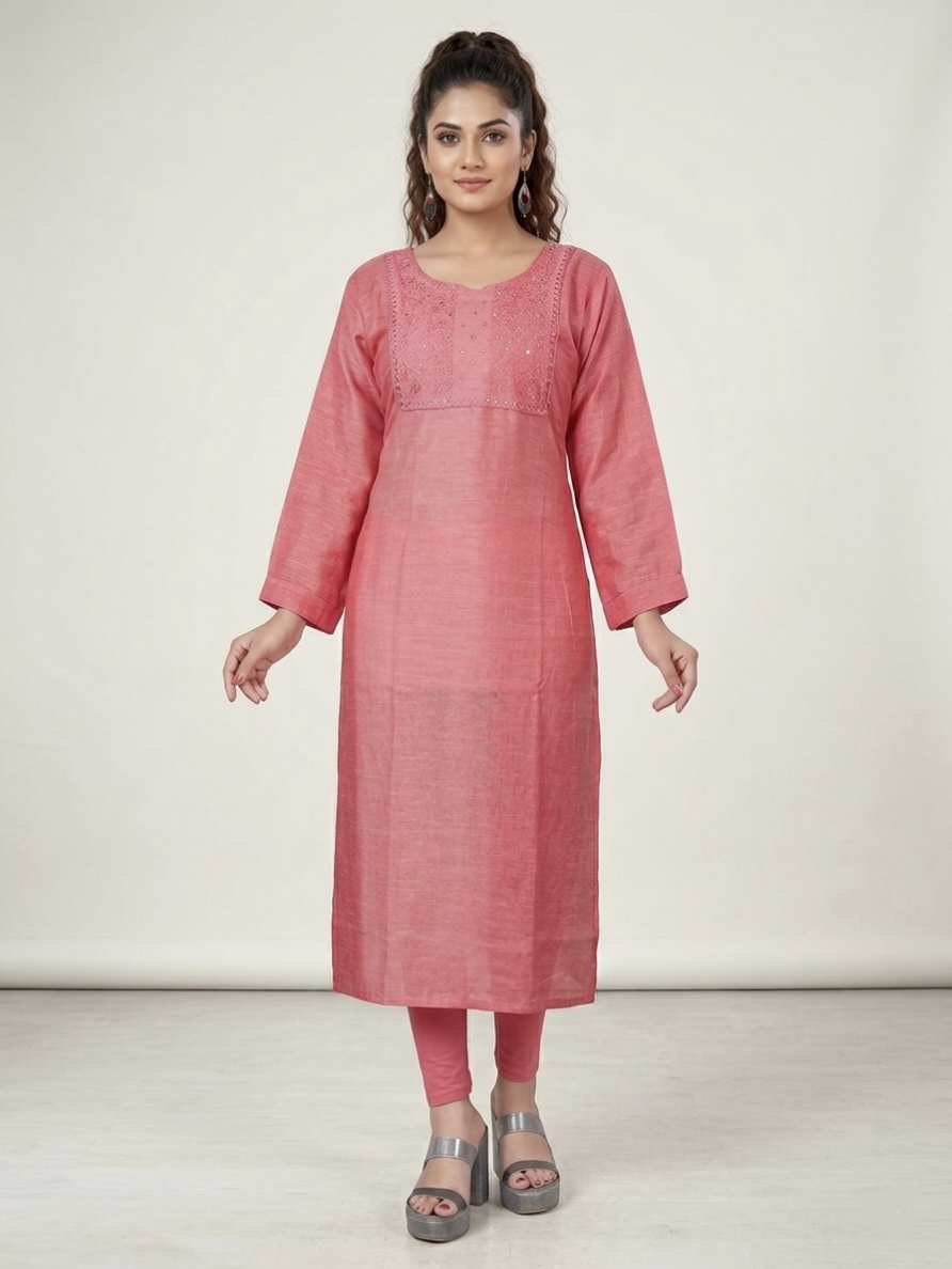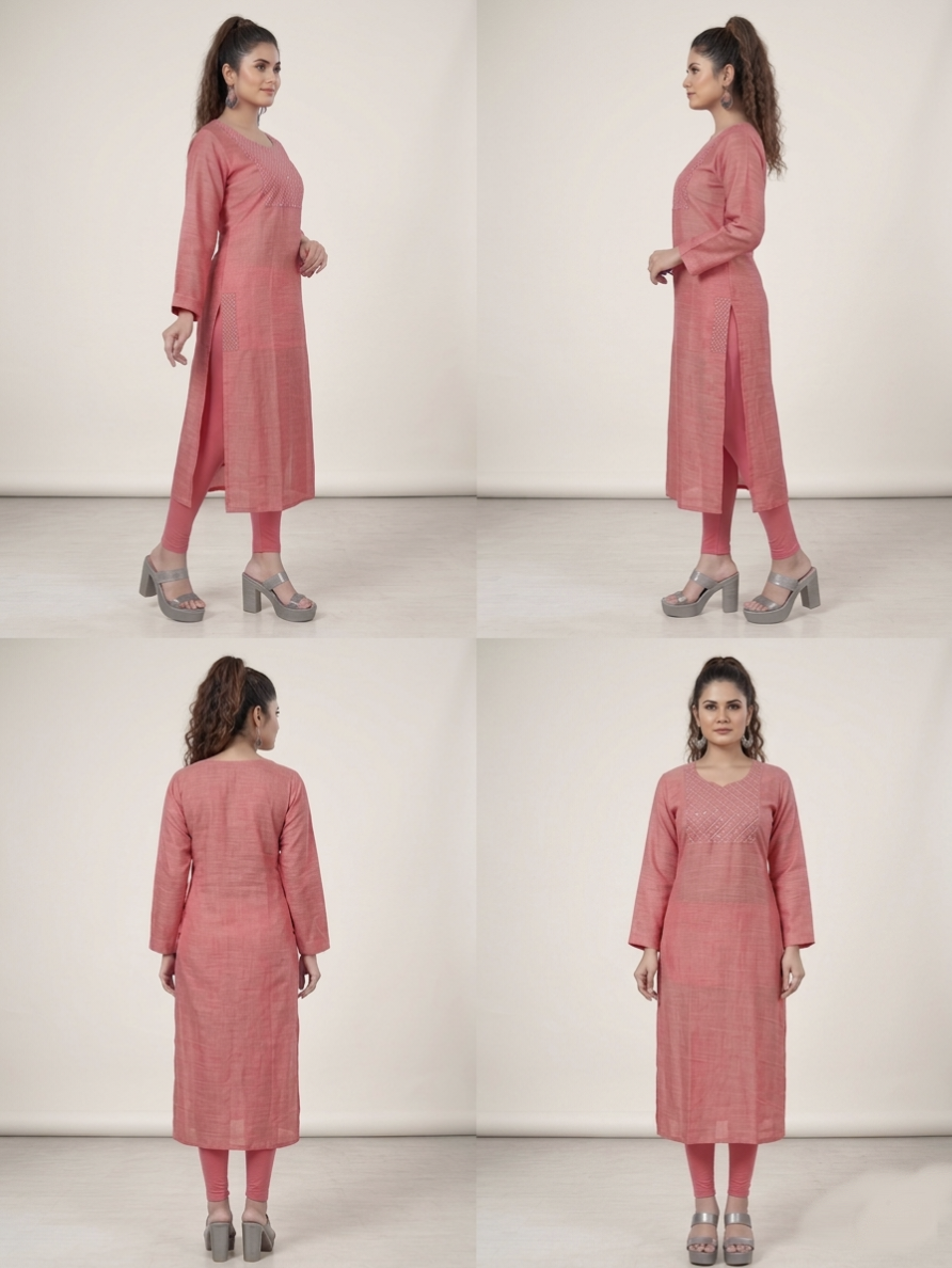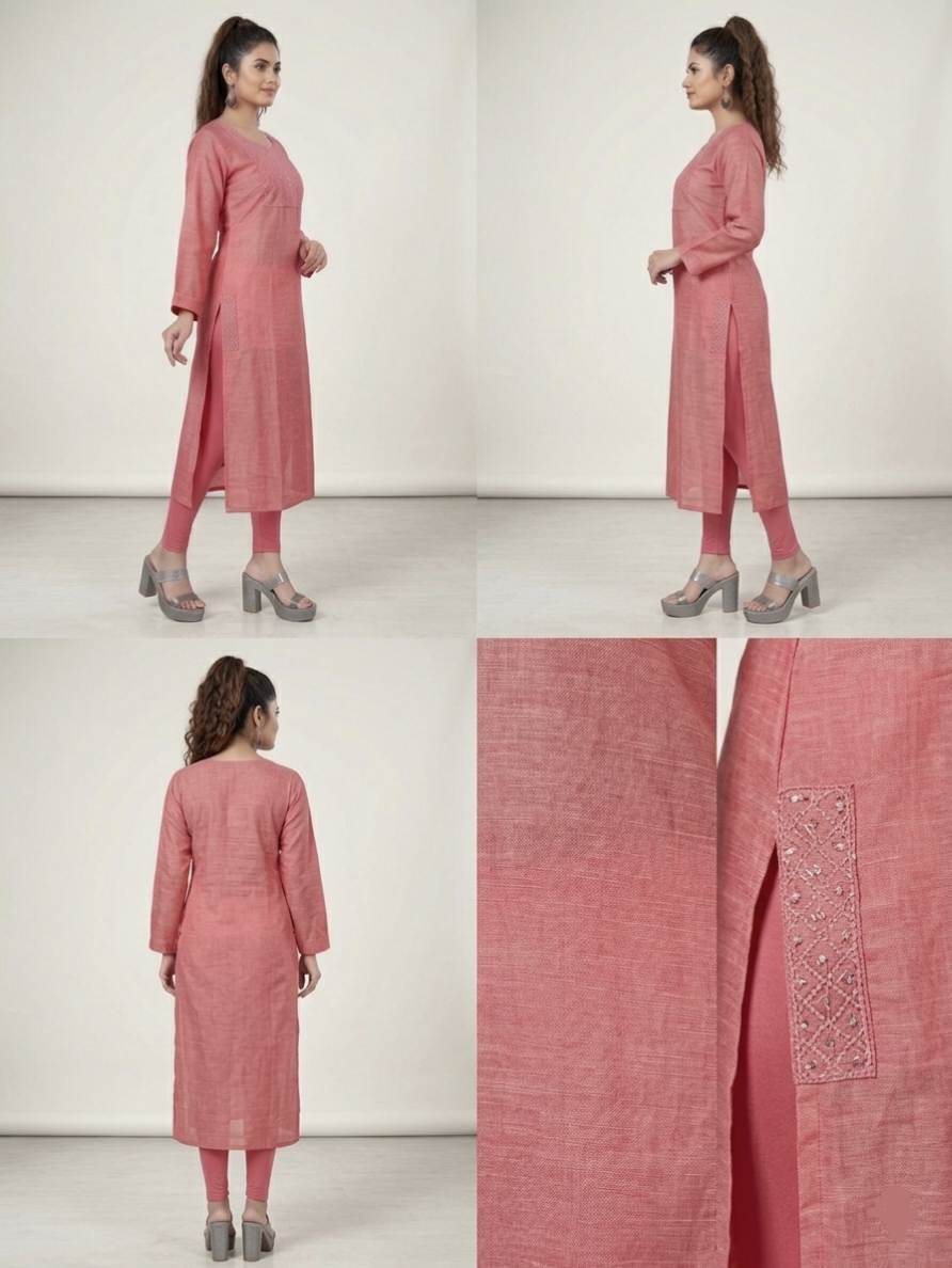 The Kurti is expertly crafted from airjet slub fabric, ensuring durability and breathability. This ensemble features a straight-cut long kurta accompanied by matching trousers, providing a refined modern ethnic aesthetic suitable for various occasions. The fabric's texture enhances comfort while maintaining a polished appearance.